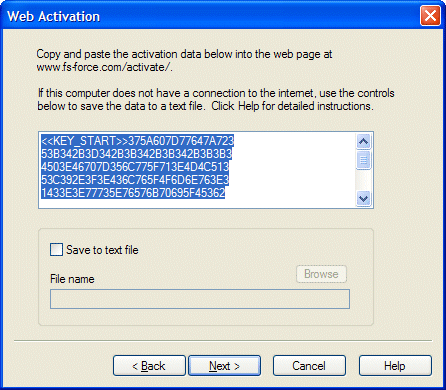 • You will then be presented with some additional text, which you need to bring back to the computer running FS Force, and paste it into Step 2 of the Web Activation Wizard.