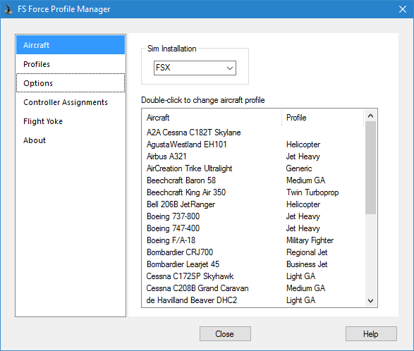 Here you will see is a listing of all aircraft found in your system, for each of the flight sims installed on your computer. To view the aircraft for a different flight sim, select it using the drop-down listbox at the top. A default profile will be assigned to aircraft that are recognized (FSX default aircraft), others will be left blank. You can assign profiles by double-clicking on the line containing the aircraft. If an aircraft does not have a profile assigned to it, and you select it in FSX for a flight, it will ask you at that time what profile you want to use. There will also be an option to permanently assign that profile to that aircraft.