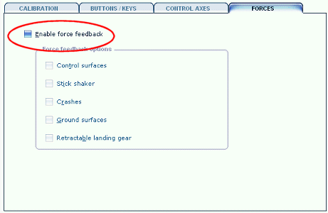 Step 5 - FSX Options Before starting a flight, make sure the default force feedback settings in FSX have been disabled. (This does not apply to early versions of P3D). This is normally done by the Setup program, but you should verify it just the same. You will find it under Settings > Controls > Forces. The reason this is important is because under DirectX, conflicts will occur if both FSX and FS Force try to program force feedback effects at the same time.