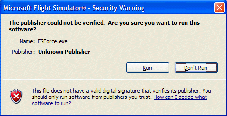Step 4 - Startup You are now ready to start up FSX. The first time FSX tries to start FS Force you will see two security warnings, one for the .EXE and one for the .DLL.