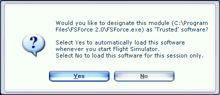Click the Run button. After the security warning, you will see another dialog box, asking if you want to trust FSForce.exe in the future. Click Yes.