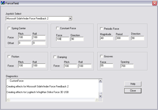 This is a small utility program you can download to test the force feedback capabilities of your joystick. If FS Force doesn't seem to be working properly, you can use this utility to test your joystick, which can be helpful in determining if the problem is with FS Force, your system, or your joystick.